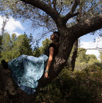 במהלך כל הפרויקט ידעתי שאני רוצה לצלם דוגמנית שיושבת על עץ, כי הרגשתי שזה יכול לתת לתמונה תחושה מאוד מיוחדת ושונה. היה לי בראש שתנוחה כזאת תחבר את הדמות עם הטבע בצורה טבעית ויפה. חיפשתי הרבה ביערות עד שמצאתי את העץ הזה, וזה לא היה קל. היו הרבה פעמים שלא מצאתי את מה שחיפשתי והייתי די מתוסכלת. בסופו של דבר מצאתי את העץ הזה, שחשתי שהוא בדיוק מה שאני צריכה – הענפים שלו היו כל כך מיוחדים והזכירו לי אפילו ערסל. כשהגעתי אליו הרגשתי שהצלחתי לגרום לדמות להרגיש מחוברת לטבע ולתכשיטים בצורה שאני רוצה. הייתי ממש שמחה שמצאתי את העץ הזה, כי הוא נתן לתמונה בדיוק את מה שרציתי, וזה הרגיש כמו בחירה מושלמת אחרי כל החיפושים.